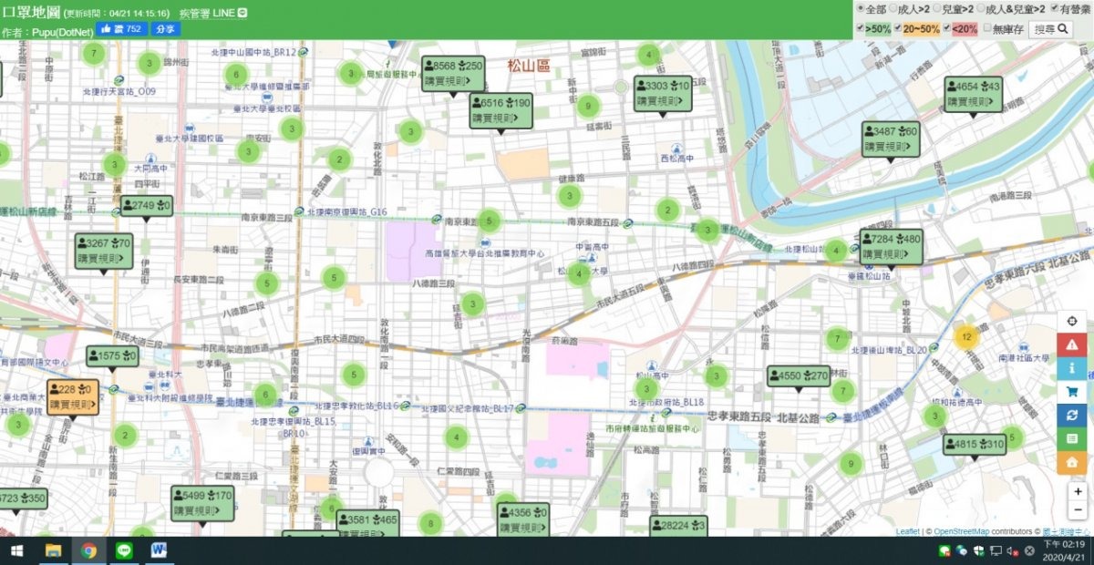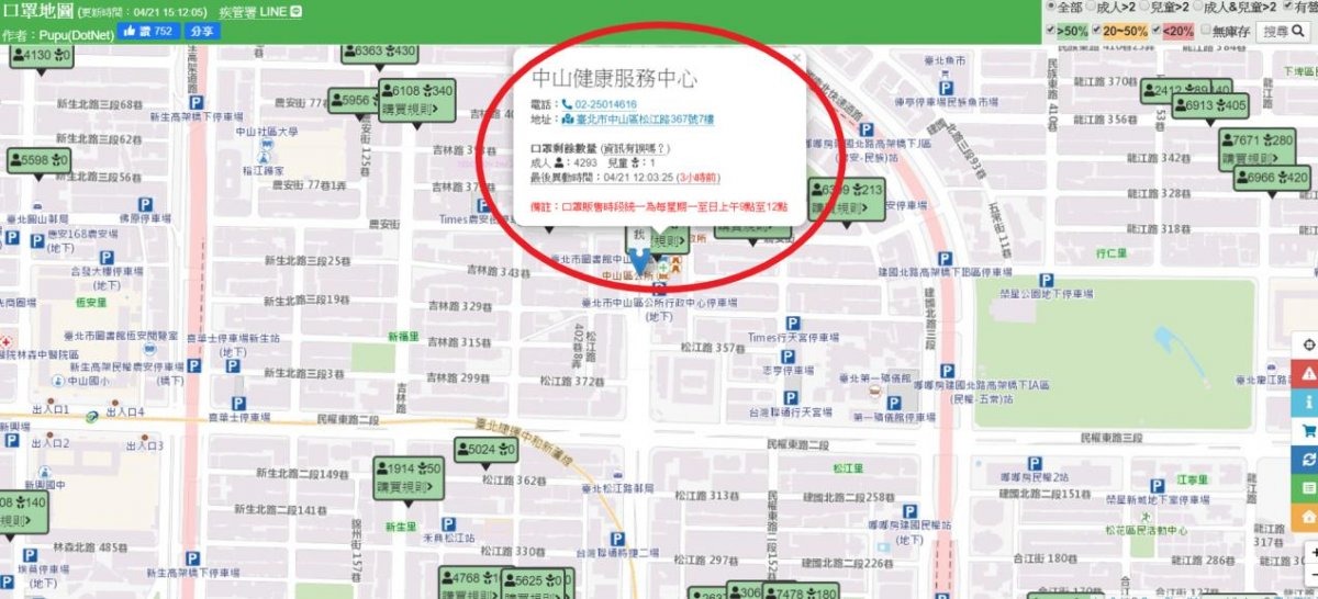 疾管署配合民間工程師推出的口罩地圖,可以在地圖上看到店家資訊,圖同時可以概略看到當前庫存的數量。
