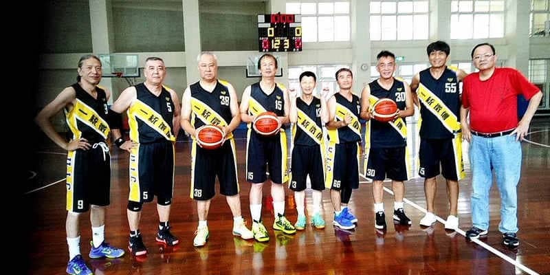 ▲一統徵信董事長石德忠(右一)為一統徵信盃籃球賽打下十年的基礎,許多國手如昝家驤(右二)、曾增球(左四)、宋建順(左三)等都前來共襄盛舉。